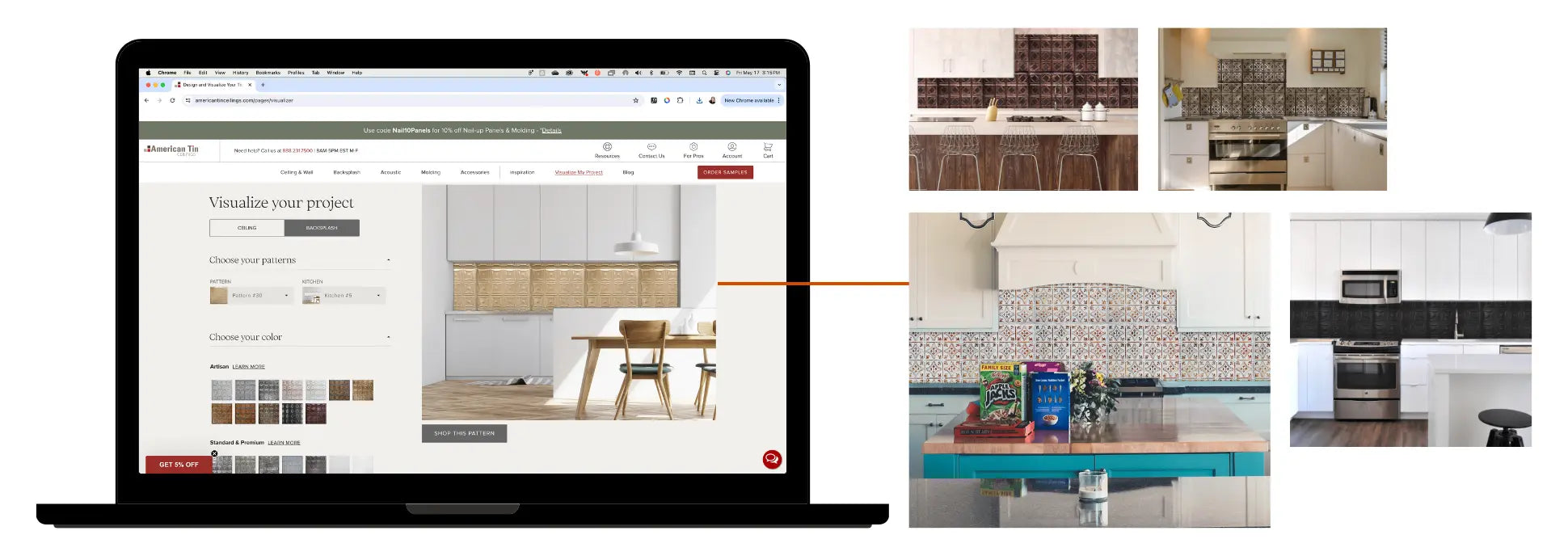 Visualize your space with American Tin Ceilings. See how our different panels, molding, and colors look together for your ceiling or backsplash project.