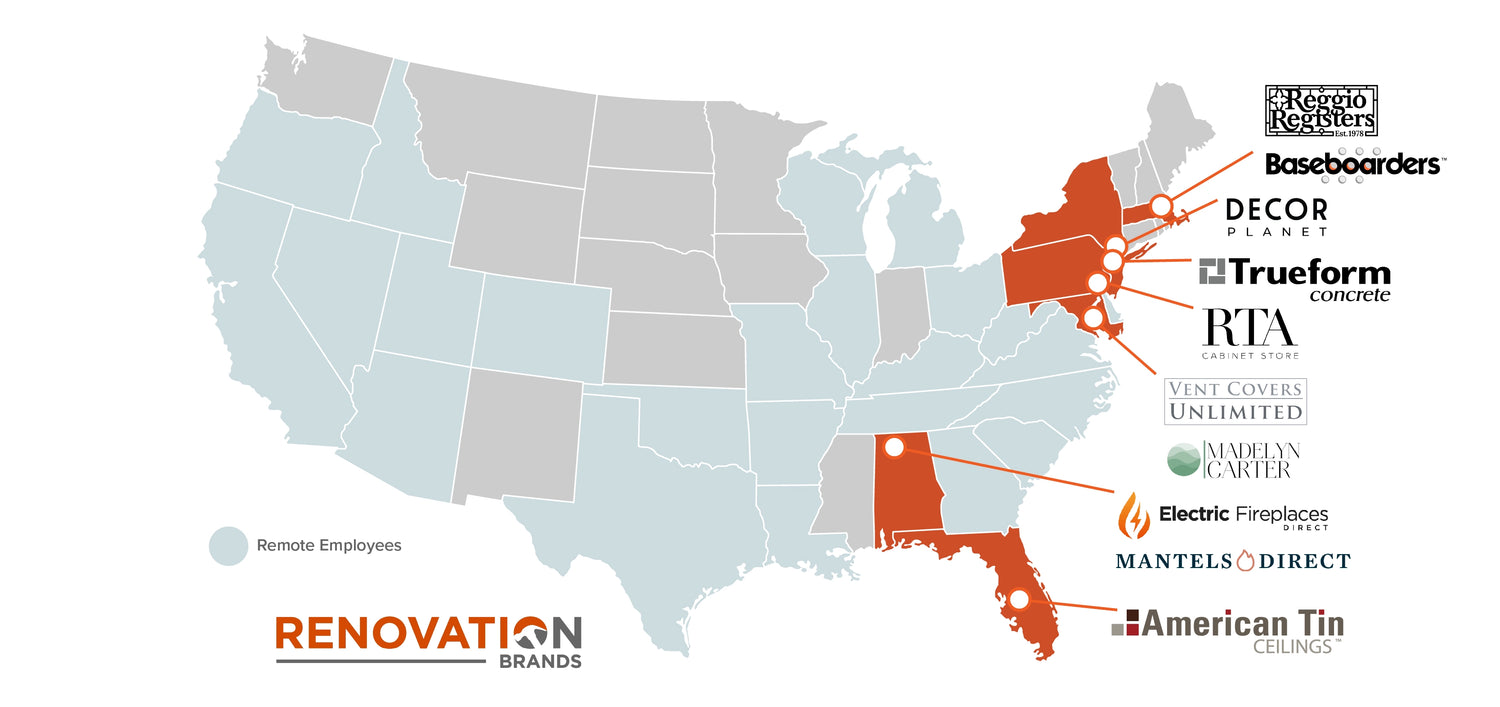 We have physical locations across the country from New Jersey to Florida, and Pennsylvania to Michigan. As a work-from-home friendly company, Renovation Brands’ employees are spread across the nation. We are always seeking high-growth, digital direct-to-consumer businesses operating in the renovation space. We’d love to talk.